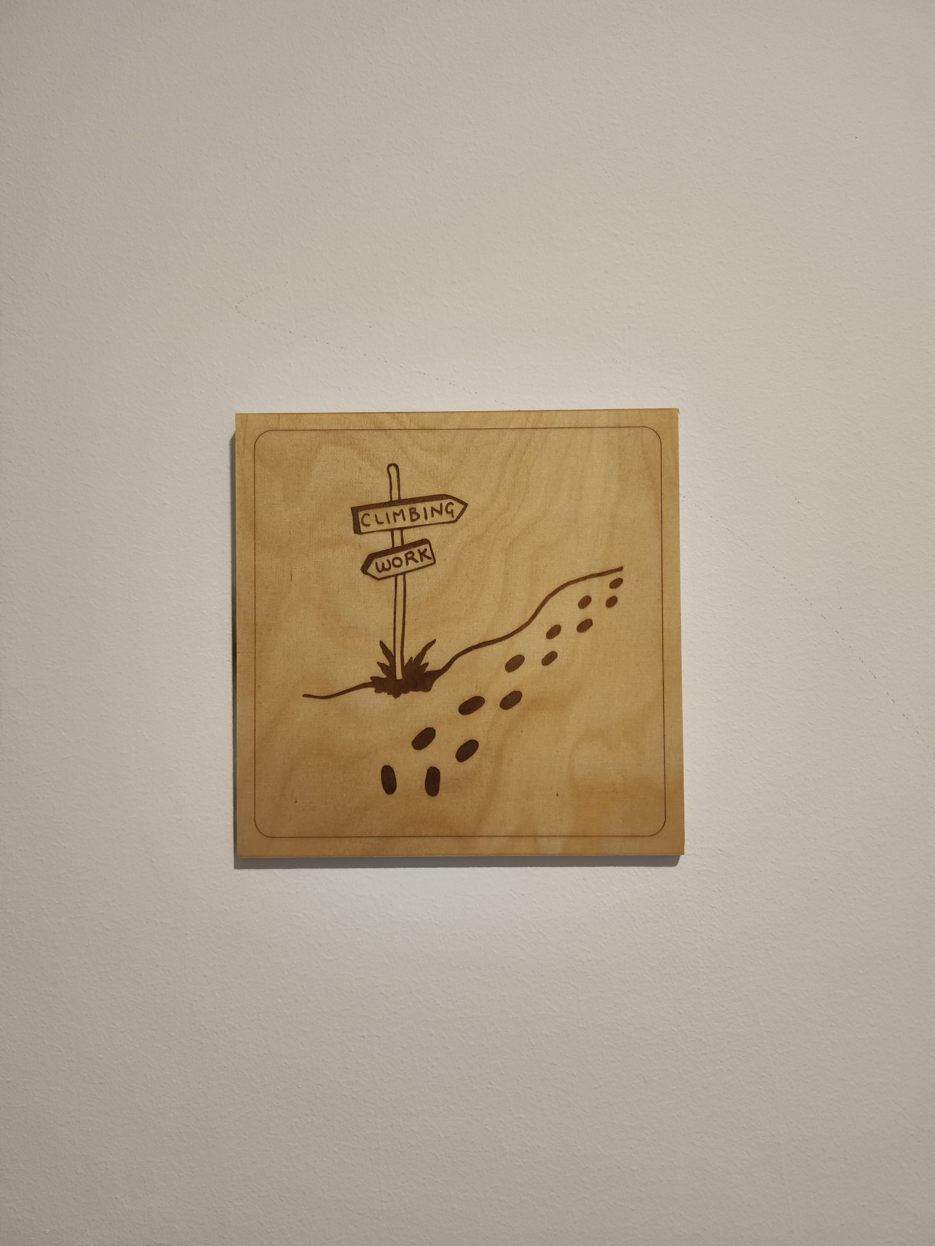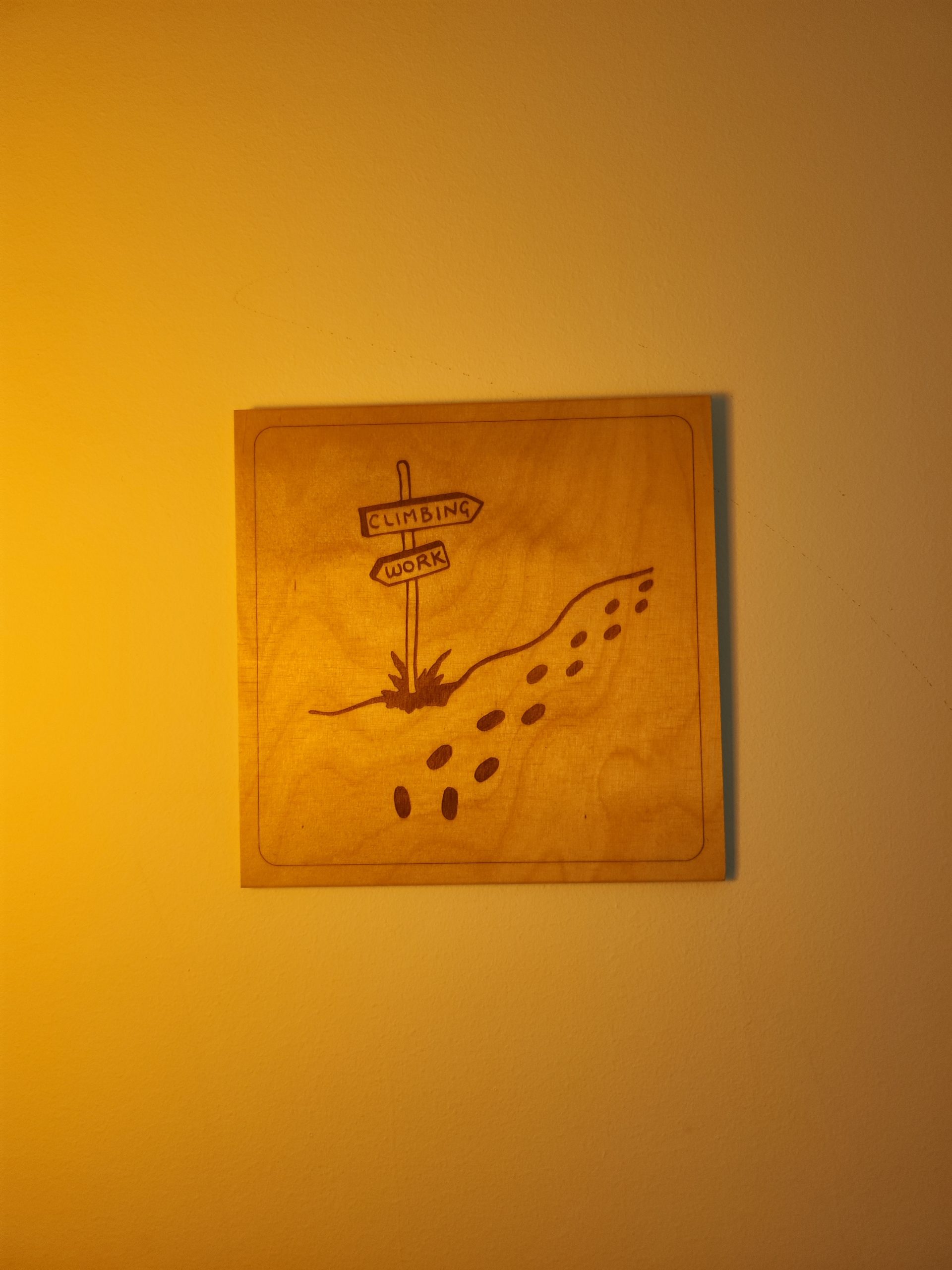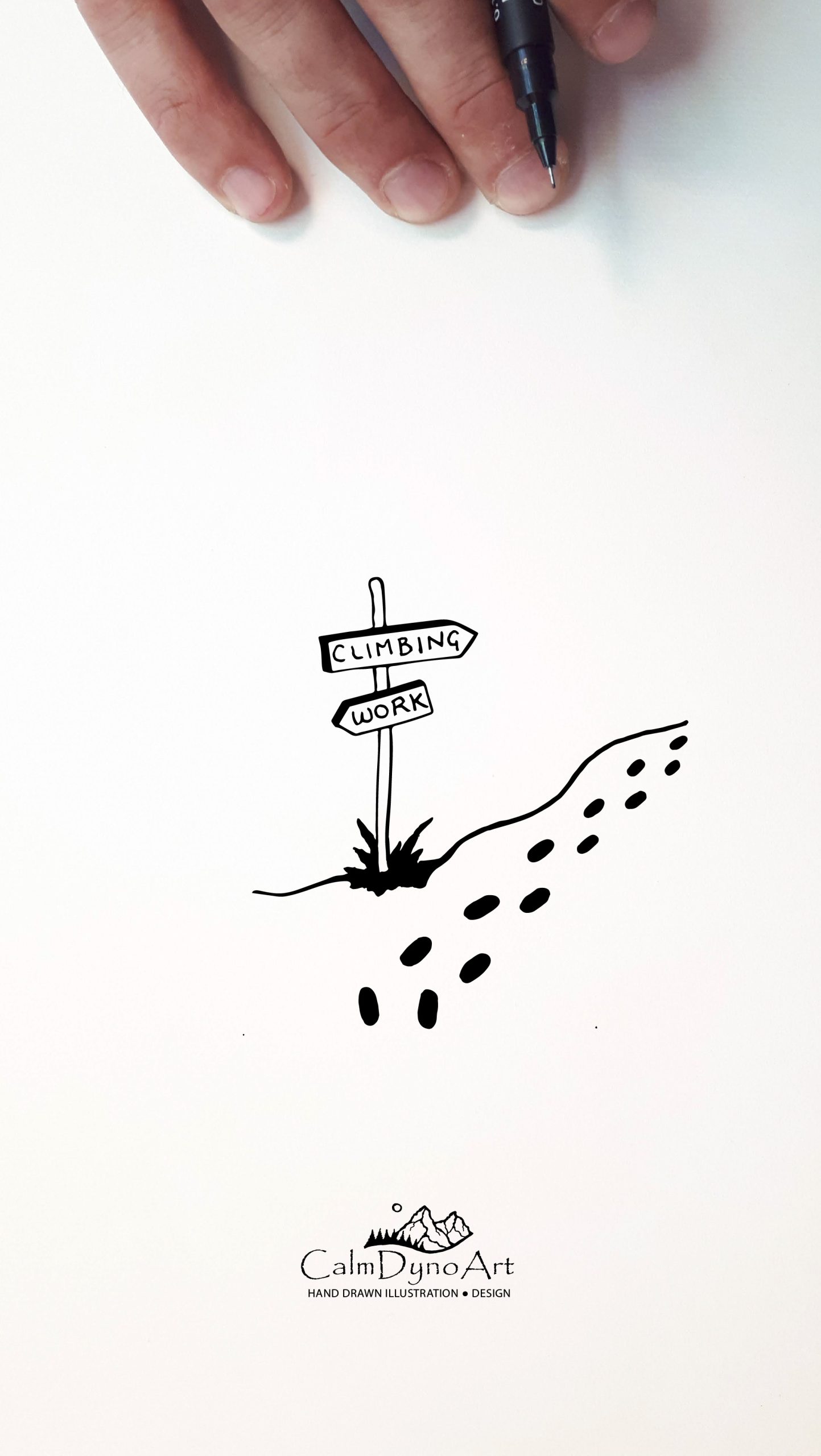 The illustration features a signpost with two directions — “Climb” and “Work” — with footprints leading toward Climb (the right choice, of course).