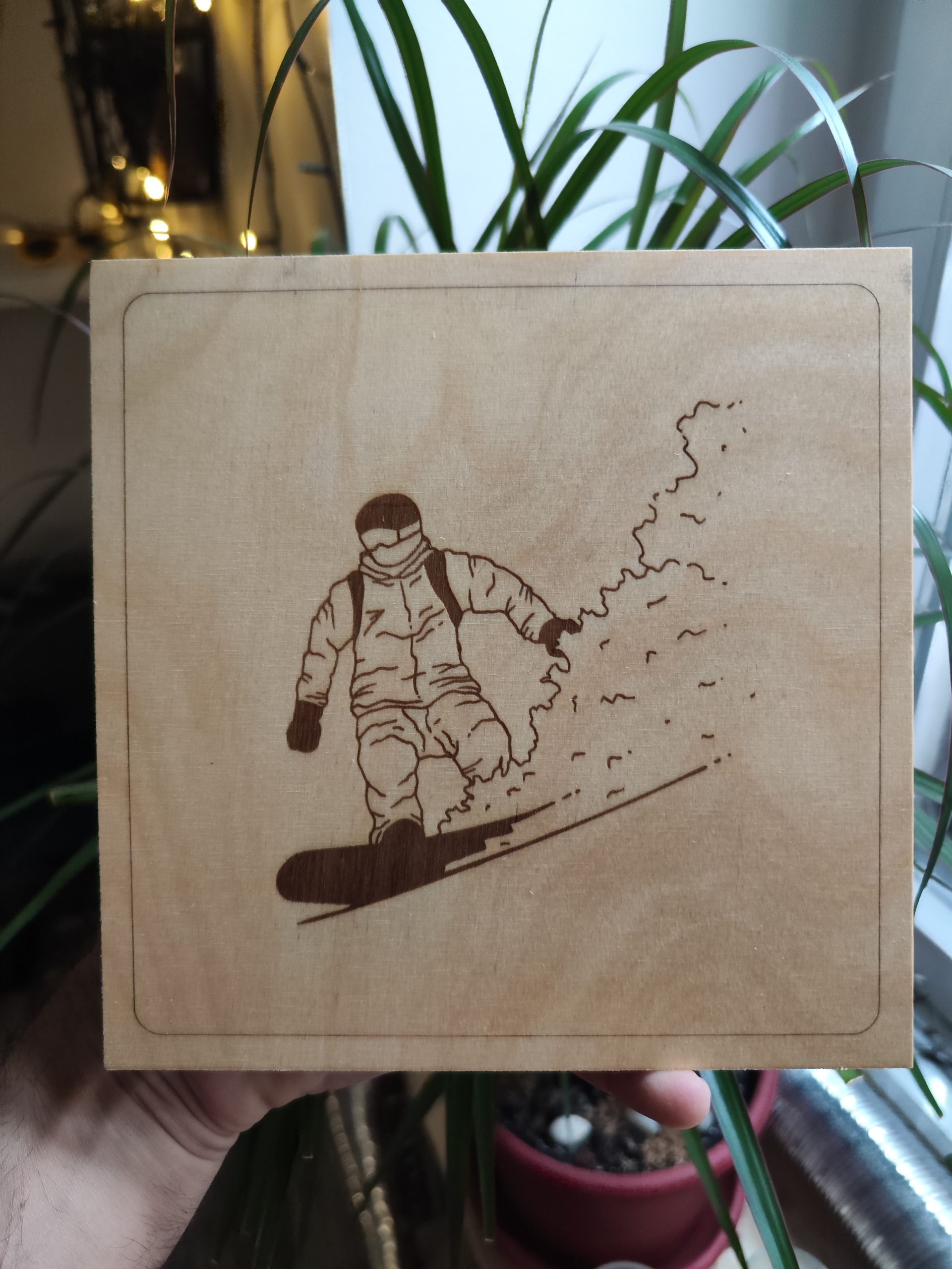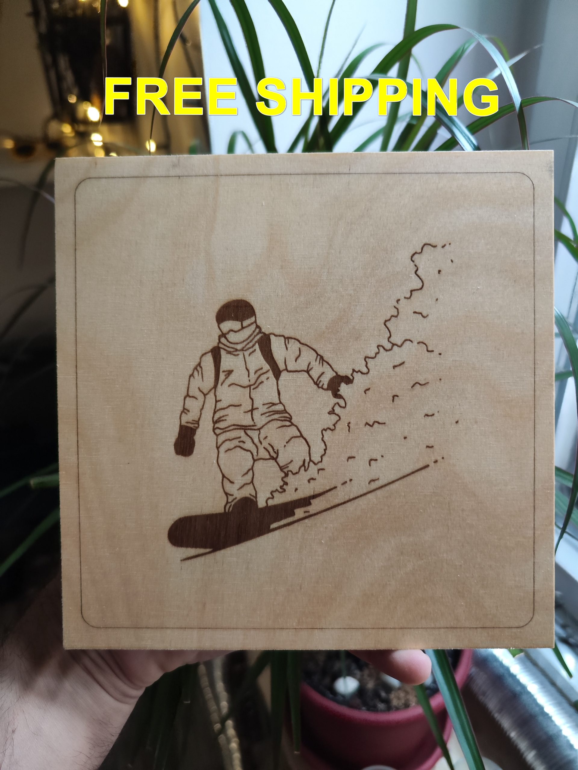 Capture the energy of winter adventure with this laser engraved wooden artwork, made from birch plywood.